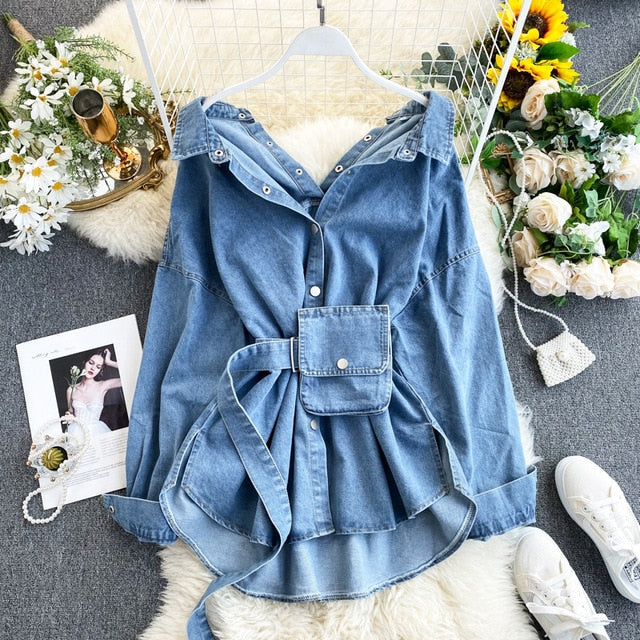 2020 Women Spring Denim Blouses Coat Turn Down Collar Sexy Button Design Womens Denim Shirt Style Coat Women Tops Blusas